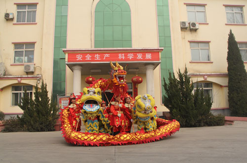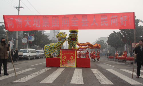 25日(农历正月初九)上午,大地集团组织龙狮盘鼓队参加宝丰县第二十三届民间艺术大赛。在县城人民路县委门前,“大地集团向全县人们问好”的大红条幅格外引人注目,精彩的龙飞狮舞不时引来观众的阵阵喝彩。