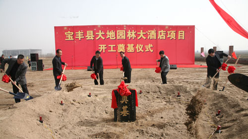 2013年3月18日上午,在县产业集聚区,鞭炮齐鸣,彩旗招展,宝丰大地园林大酒店项目正式开工奠基。县领导刘书锋、张庆一、梅玉三、铁干卿、赵二成、副县级干部李自钦等分别参加仪式并为项目开工培土奠基。县长张庆一致辞。县委常委、常务副县长李留军主持开工仪式。集团领导张怀平、张彪、王福文等参加。 张庆一说,我县第三产业发展前景广阔,服务业市场潜力巨大。幻影体育(中国)官方网站抢抓机遇,乘势而上,在此建设园林式酒店,对于填补宝丰五星级宾馆的空白,以及提升城市品位、完善城市功能、展示城市形象、推动商贸繁荣和优化经济结构,都具有十分重要的意义。希望相关职能部门要齐心协力,密切配合,促进项目快建设、快竣工、快见效,带动第三产业的快速发展。同时,希望项目施工单位科学管理,精心施工,高效推进项目建设,努力把大地园林大酒店打造成为优质工程、精品工程、标杆工程。 宝丰大地园林大酒店项目是大地集团根据企业发展需要,多元化发展,向“三产”业转移,投资新建的五星级酒店、水上乐园、员工社区等项目。该项目由中国建筑设计研究院设计,位于长安大道与省道豫02线交汇处,地处宝丰高新技术产业集聚区,前临应河,后依文峰公园,交通便利,位置优越。总占地面积100多亩,总建筑面积5万多平方米,预计总投资约3亿元。 此项目在推动宝丰县社会经济发展、完善城市服务功能等方面具有深远的战略意义。项目建成后将进一步提高平顶山、宝丰的城市品位和对外形象。