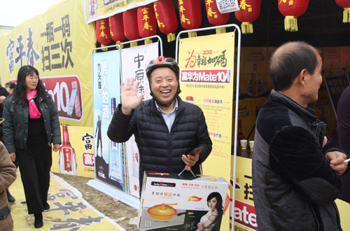 中奖者怎一个“乐”字了得 随着涌动的人潮,笔者来到书会现场,沿路两旁挂满了富平春的彩色吊旗和大红气球,把会场装扮得格外热烈和喜庆。会场中间摆满了贾湖酒业义务为广大商户和艺人搭建的暖心帐篷。更引人注目的是那招人喜爱的瓶模,穿着不同色彩,不同形状的衣服分散在会场各个角落,并不时地与大家握手互动,引得许多群众与之合影留念,更是惹得小朋友们欢欣不已。更为给力的是那神奇惊险的大巴悬浮超人,不时与现场群众争相留影互动。