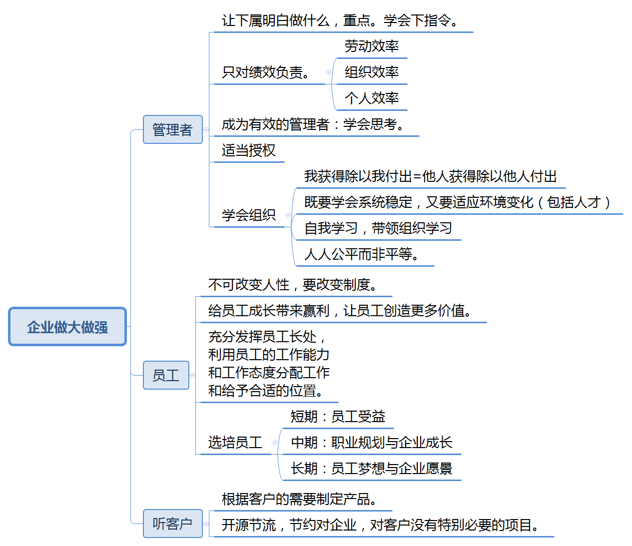为期5天的中旭培训学习结束了,非常感谢公司对我的信任,为我提供了这次宝贵的学习机会。管理者的五项修炼,使我收获很大,自己对管理这件事和管理者资格角色都有了更深刻的认识,这些知识对于今后的工作有很大的帮助和提升。 管理者的五项修炼,从基层,中层到高层管理者,全面的讲解了什么是管理者,如何成为一名合格的优秀的管理者。不仅使我对当下的工作有了新的认识,也对未来的的工作有了更明确的方向。同时,对集团的很多决策有了深入的理解,对幻影体育(中国)官方网站也有了新的认知,加深了对企业的认同感。 以下是这5天培训的一些心得体会: 一、管理者与管理的目的 管理者的作用是解决问题而不是成为问题,管理是为了解决效率问题。 管理者不是每天坐在办公室里思考问题,而是要发现问题并能够解决问题。没有调查,就没有发言权。所以要经常与上下级沟通,发现问题才能弄清楚问题的根本原因。与上级沟通能够更好的理解领导布置的任务,与下级沟通能够了解每个人的长短处,分工才能让正确的人去做正确的事。 二、通过改变制度从而改变人的行为 制度就像河道,人就像河道里的水,水本身没有好坏,人也一样。 制定一个适合自己公司门的制度不仅可以约束员工,同时还能激励员工。每个企业和部门都有不同的实际情况,制定制度不能生搬硬套,没有最好的制度,只有适合的制度。 三、管理始终为经营服务 一般人们总是说经营管理,在培训之前我也一直以为是一件事,通过培训学习才知道,两者有着本质的区别。 经营解决收入问题,管理是为了控制支出;经营是为了增大被减数,管理是为了减小减数;管理做的再好也不会做到不支出,但是经营不好却可能没有收入。经营的第一要素是客户价值,公司对外经营有客户,部门对内经营一样有客户。一条生产线、上下游部门之间、平行部门之间都是彼此的客户,经营好各部门的客户才能有效合作、减少浪费和失误,才能真正做到减小减数,提高公司利润。 四、管理事和领导人 俗话说,铁打的营盘流水的兵,其实就是说的流程管理。 一个公司,一个部门,一个岗位,人员都在不停的流动。通过制定一个固定有效的流程,可以很好的避免因为人员流动造成的重复培训浪费、提高工作效率。比如以我现在的岗位中控操作员为例,按照操作规程操作,新进的学徒也可以很快掌握操作的要点重点,学习起来就事半功倍。 五、管理追求对等而非平等 因为分工不同,每个人承担的责任是不一样的,所以每个人的回报也是不一样的。在看到自己和别人回报的差别时应当首先想一下我们担当到的责任是不是一样,付出是不是一样。责任,权力,利益相互平衡,管理才能平衡,任意一点失衡,人们就会通过牺牲另外两点来弥补。 另外,通过学习,我对企业如何做的更好有了初步的认识,如下图: